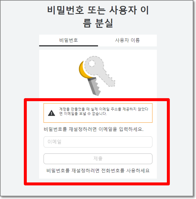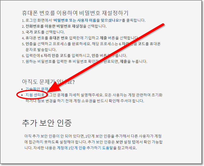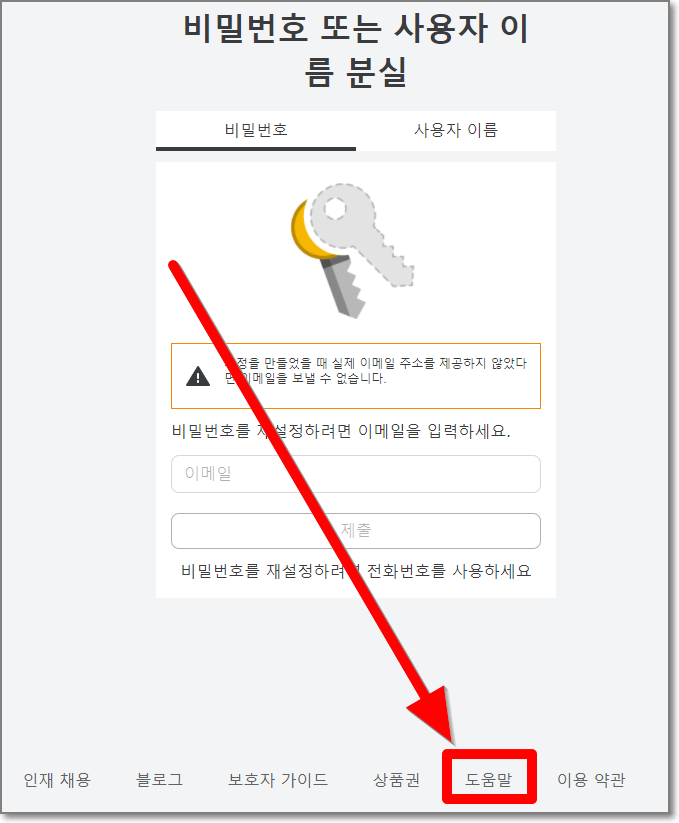 "비밀번호를 잊어버렸어요"에 대한 내용이 나오는데 읽어보면 이메일이나 휴대폰번호를 입력했을 때 내용입니다. 밑으로 스크롤을 쭉 내립니다.