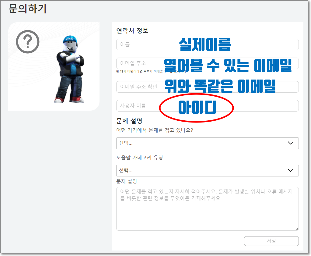 아래와 같은 "문의하기"화면이 나옵니다. 여기서 연락처 정보에 있는 맨위에 "이름"은 실제 자신의 이름을 적으시고 중간에 있는 "사용자 이름"은 아이디를 쓰시면 됩니다. 그리고 이메일은 답변을 받아야 하므로 반드시 기억이 나는 이메일을 적으셔야 합니다. 나중에 이메일이 오면 열어볼 수 있게 로그인이 되는 이메일을 적으셔야 합니다.