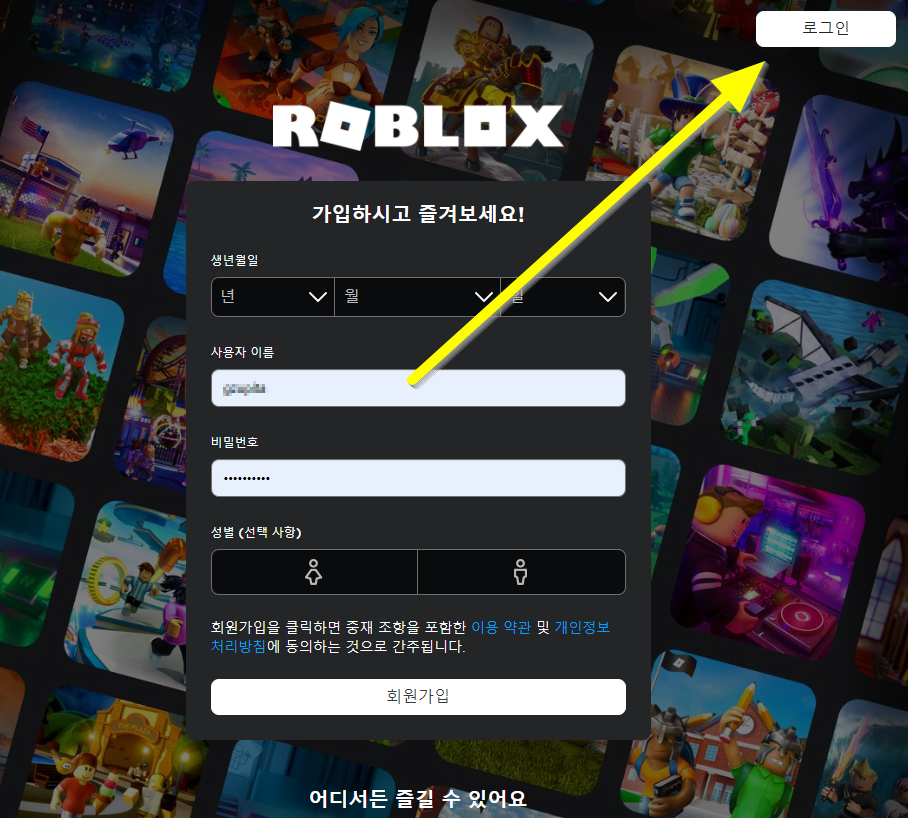 우선 로블록스 홈페이지를 접속합니다. 링크를 누르면 새창으로 열리게 됩니다. 이상태에서 화살표친 "로그인"을 누릅니다.