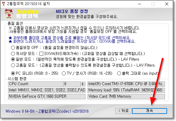 비디오 품질 설정창에서 현재 Z통합코덱을 설치하고 있는 컴퓨터의 사양이 나옵니다. 사양을 고려해서 최대의 영상 품질을 내기 때문인데요. 눈으로 확인 후 "계속"을 눌러 줍니다.