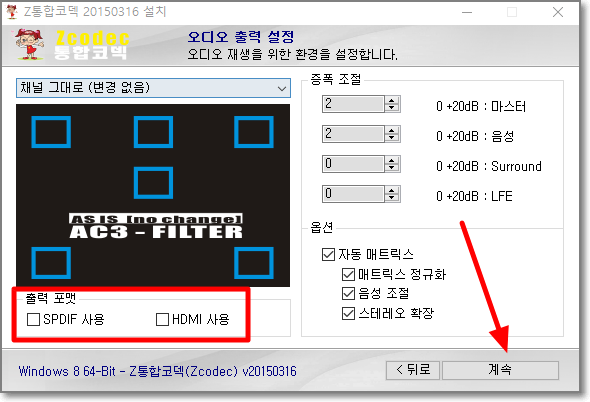 오디오 출력 설정창에서 만약 광출력 오디오를 사용중이라면 SPDIF사용에 체크해주시고, HDMI케이블로 소리와 영상을 함께 보고 계신다면 HDMI사용에 체크하신 후에 "계속"을 누릅니다.