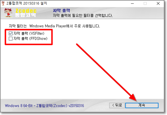 자막출력은 VSFilter를 선택(윈도우 미디어 플레이어에서 사용)하고 "계속"을 누릅니다.