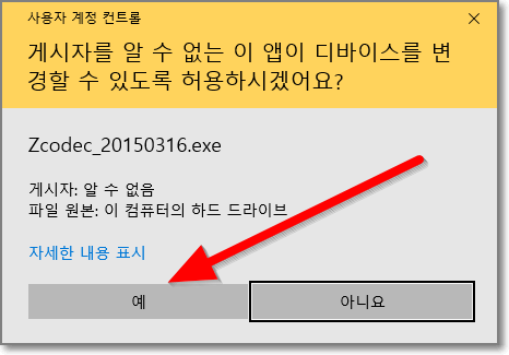 게시자를 알 수 없는 이 앱이 디바이스를 변경할 수 있도록 허용하겠냐고 묻는말에 "예"라고 합니다.