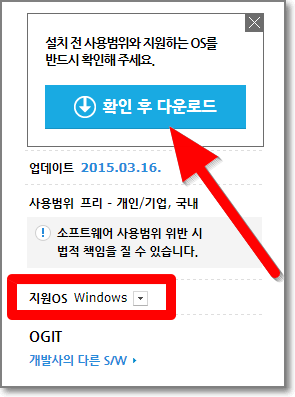 다운로드를 누르면 설치 전 사용범위와 지원하는 OS를 반드시 확인하라고 나옵니다. 사용범위는 프리웨어라서 누구나 무료로 사용할 수 있고요. 지원OS는 윈도우입니다. 혹시 맥을 쓰고 계신다면 이 설치파일은 지원하지 않습니다.