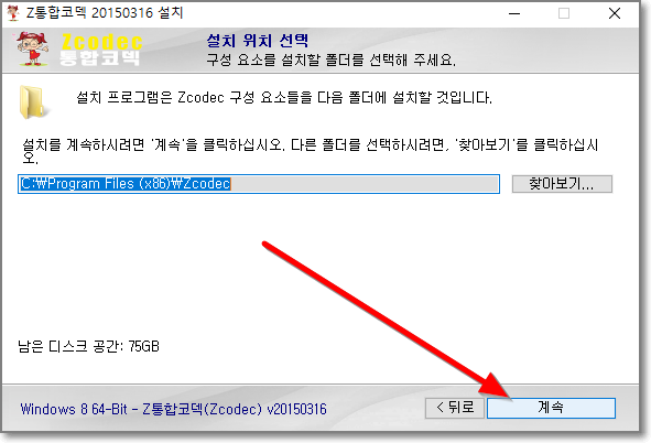 설치위치 선택창에서 그대로 둔 상태로 "계속"을 누릅니다.