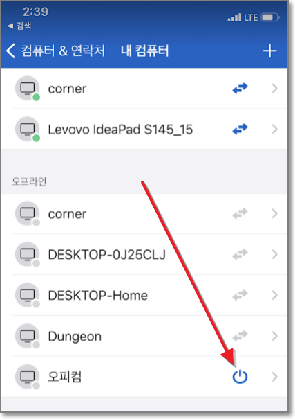 컴퓨터 목록이 보일 것입니다. 제가 이번에 설정한 컴퓨터의 이름은 "오피컴"입니다. 사무실 컴퓨터라는 뜻으로 만들었는데 이름이 영 안좋은 것 같습니다. 어쨋든 오피컴 옆에 보시면 전원버튼이 생긴 것을 보실 수 있습니다. 오피컴이 꺼져있으면(절전모드) 여기에 전원버튼이 나타나게 되고 켜져있으면 위로 올라가서 온라인 쪽으로 가게 됩니다.