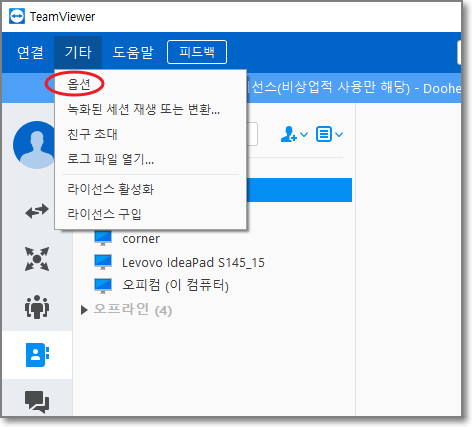 팀뷰어의 "기타"에 "옵션"으로 들어갑니다.