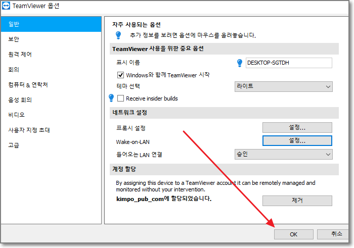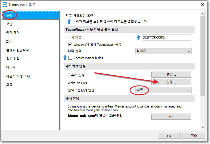 팀뷰어 옵션에서 "일반", "네트워크 설정"의 들어오는 랜 연결은 "승인"으로 해주시고, Wake-on-LAN에 있는 "설정"을 눌러줍니다.