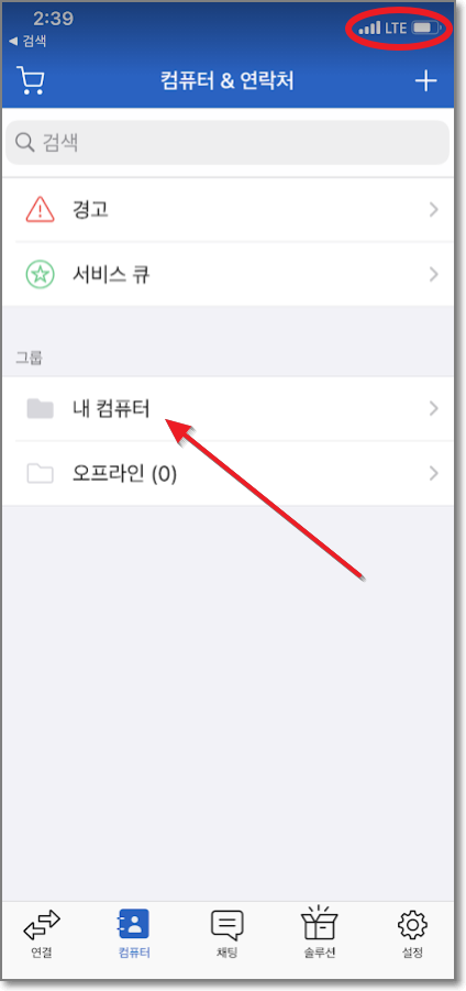 스마트폰에서 팀뷰어를 실행시키고 "내 컴퓨터"를 누릅니다.(이때 통신모드는 LTE여야 합니다. 와이파이를 꺼야 된다는 것입니다.)