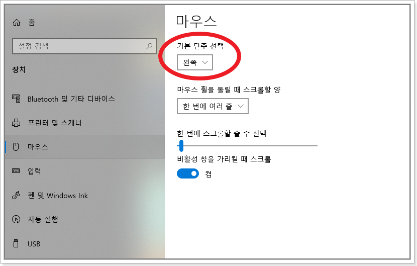 다행히도 이 기능은 윈도우에서 기본으로 제공하더군요. 윈도우 설정에서 마우스쪽에 가면 아래처럼 기본단추를 선택할 수 있게 되는데요. 여기서 왼쪽을 오른쪽으로 바꿔버리면 왼손으로도 검지로 눌러서 기존의 왼쪽 클릭처럼 할 수가 있습니다.