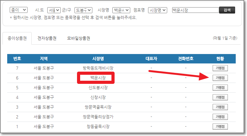 위에 사진은 도봉구 백운시장에 있는 "제일기름집"과 "야채천냥"입니다. 과연 두매장 모두 온누리상품권이 가능할까요? 우선 도봉구로 지역을 정하고 백운시장을 선택합니다. 도봉구에는 전통시장이 7군데 있군요. 아래와 같은 화면에서 "가맹점"을 눌러봅니다
