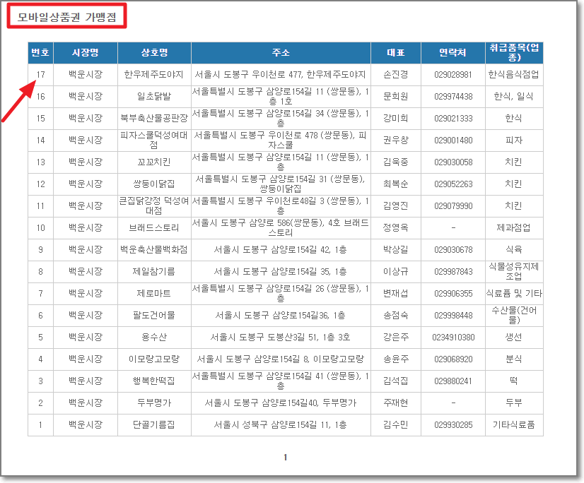 여기서 끝이 아닙니다. 종이상품권을 사용할 수 있다고 꼭 카드(전자상품권)와 모바일 상품권까지 쓸 수 있는 것은 아닙니다. 아래에서 보듯시 같은 백운시장이라도 모바일상품권으로 검색을 하면 가맹점이 17개가 나옵니다.