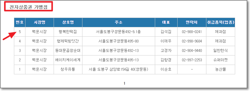 그리고 전자상품권(카드)으로 검색을 하면 가맹점이 5개가 나옵니다.