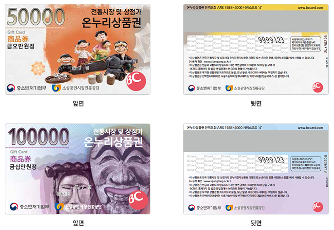 전자상품권 즉 카드에는 두종류가 있는데요. 하나는 위에 그림처럼 금액이 쓰여있는 무기명식(현금과 같습니다. 분실하면 주은사람이 사용할 수도 있어요)과 충전해서 쓰는 아래처럼 생긴 기명식이 있습니다.
