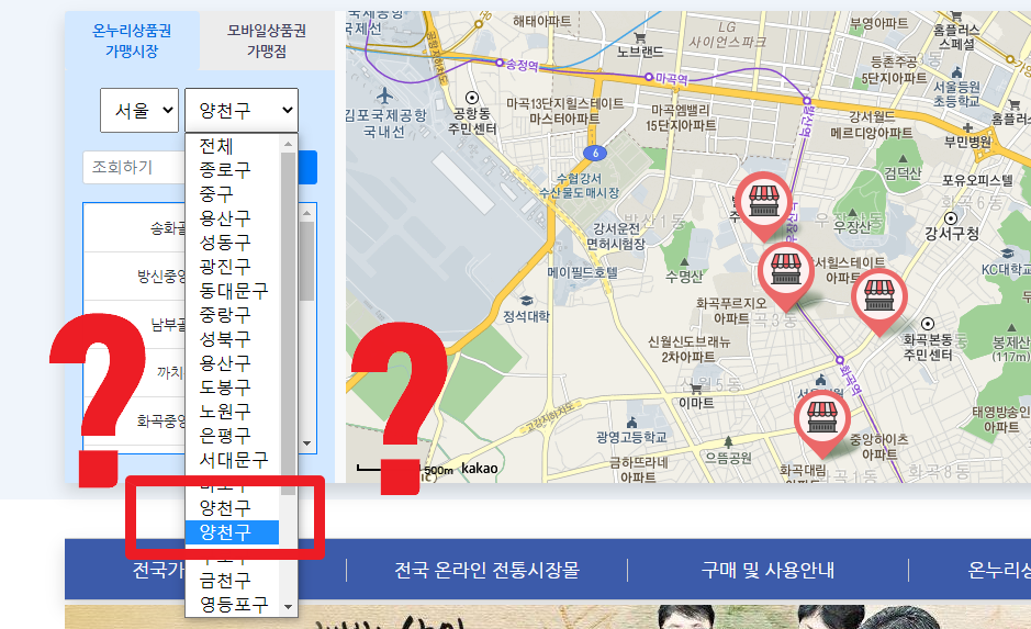 ???? 양..양천구가 2개이고 강서구가 없습니다. 소상공인시장진흥공단이 용역을 주고 검토를 안했나봅니다. 두번째 양천구를 선택하면 강서구 지도가 나오는 걸 보면 글자만 잘못된거 같네요.