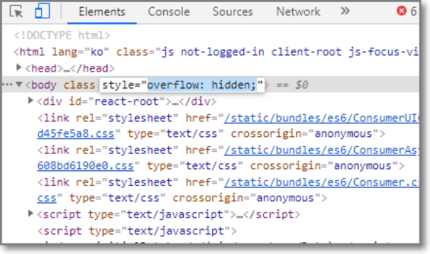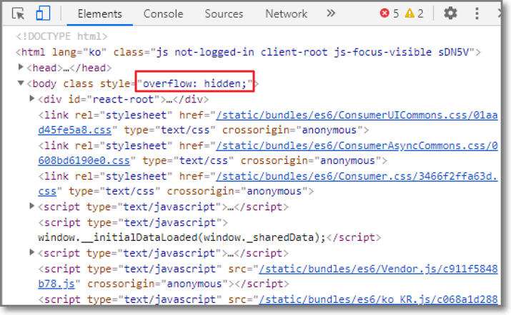 잘 따라하시면 됩니다. 우선 소스코드 창에서 위에 "Elements"밑에 파란줄이 있는지 확인하시고 그대로 스크롤을 맨아래로 내립니다.