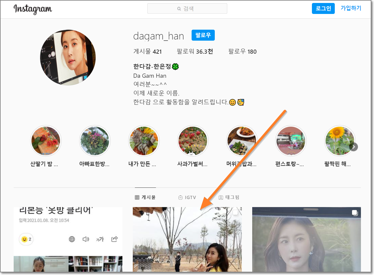 한은정님이라고요? 개명했습니다. 한다감님 인스타그램이 열립니다. 스크롤을 하면서 사진을 쭉 봅니다.