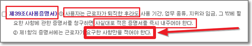 위에 보시는 것처럼 근로기준법 제 39조(사용증명서)에는 사용자는 근로자가 퇴직한 후라도 증명서를 즉시 내주어야 하는데, 그 증명서에는 근로자가 "요구한 사항만"을 적어야 한다고 써있습니다. "요.구.한.사.항"만을요.