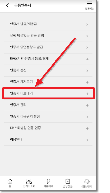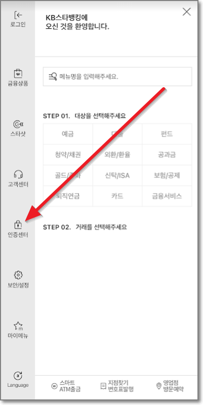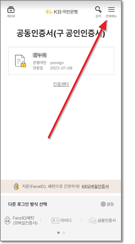 ▶ 스마트폰에서 국민은행 앱을 실행하고 우측 상단에 "전체메뉴"를 누르고 나오른 화면에서 "인증센터"를 누릅니다.