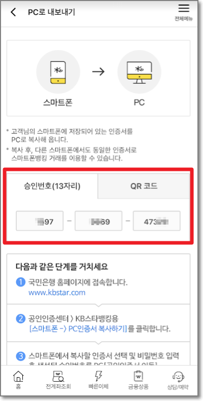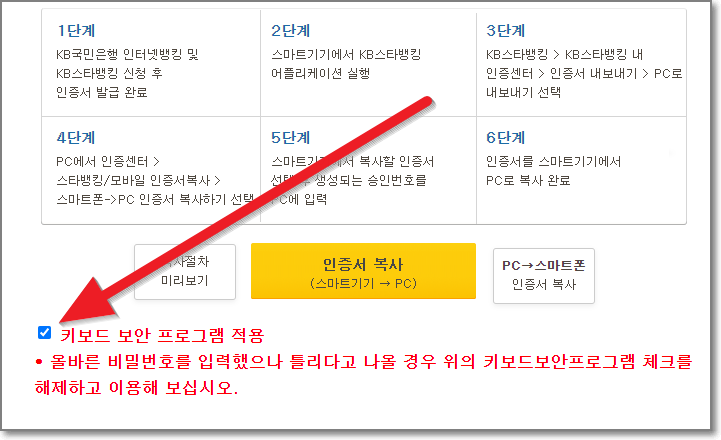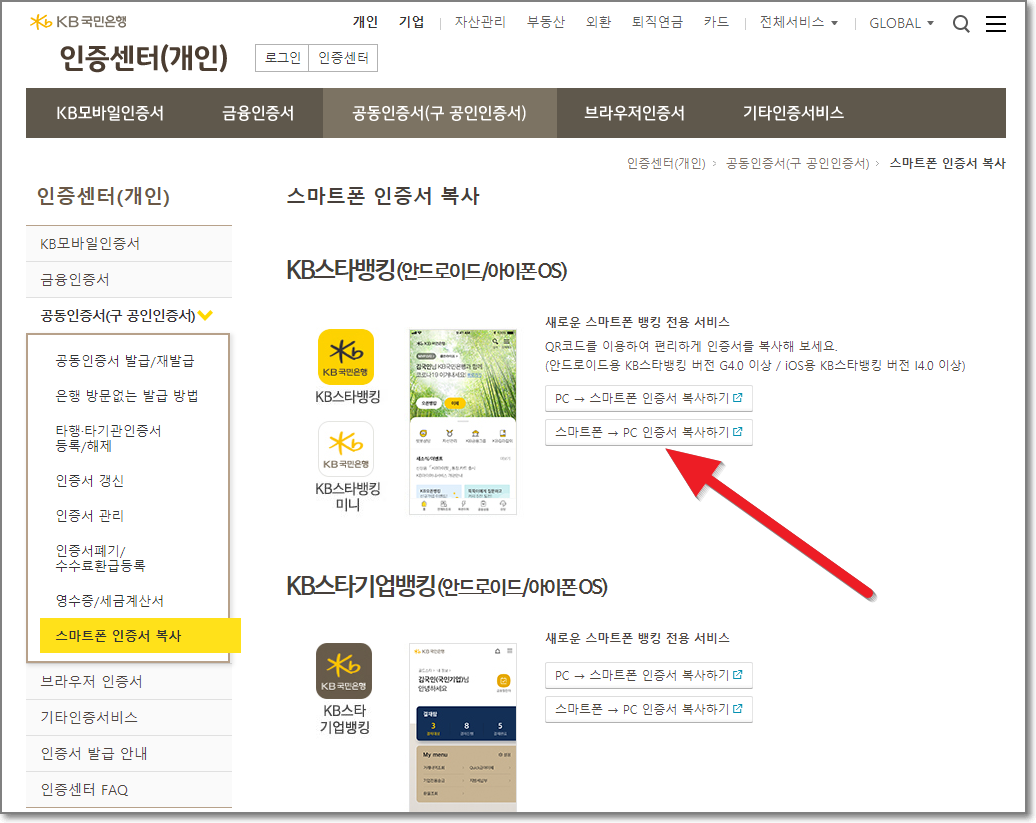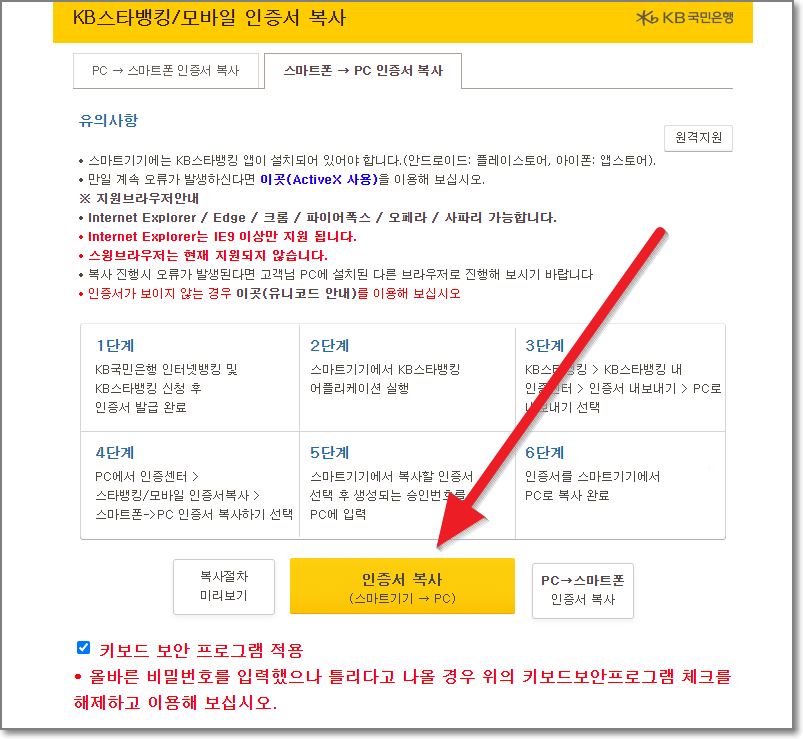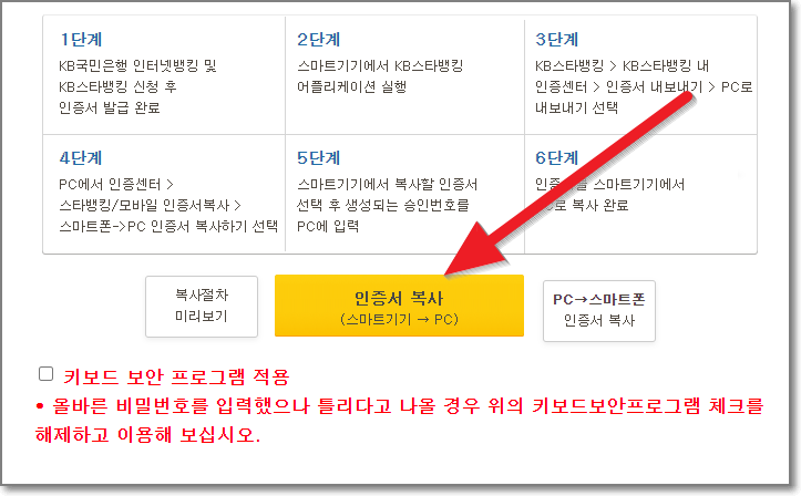 KB 스타뱅킹/모바일 인증서 복사 화면에서 아래쪽에 있는 노란색 박스안에 있는 "인증서 복사(스마트기기 → PC)"를 누릅니다.