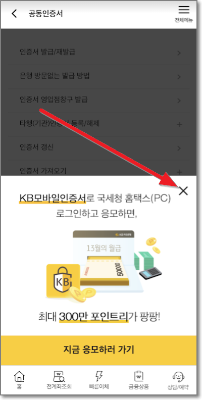 그리고 세번째 있는 "공동인증서(구 공인인증서)"를 누르면 오른쪽 같은 이벤트 창이 뜰 수도 있습니다. 화살표친곳의 X를 누르거나 실제로 KB모바일인증서를 발급해보시려면 아래쪽에 있는 글을 참고해주세요.