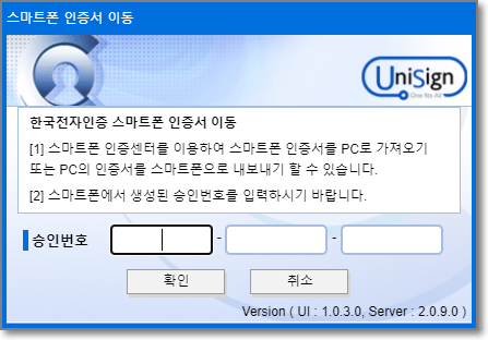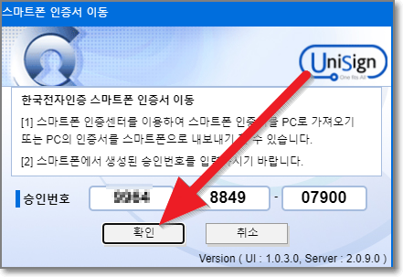 그리고 나온 스마트폰 인증서 이동창에서 "승인번호"에 아까 폰에서 받은 번호를 그대로 입력하면 됩니다.