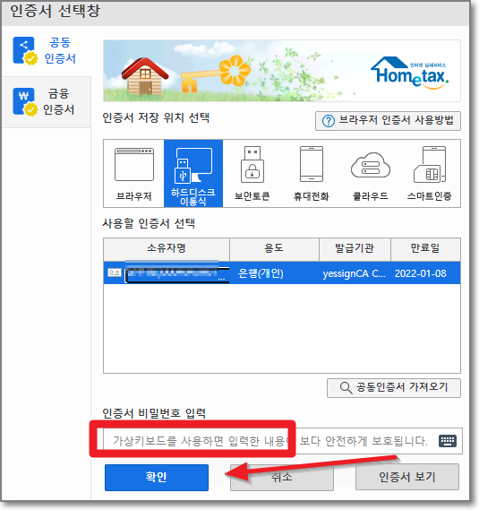 인증서 선택창에 아마도 하드디스크에 있는 공동인증서가 제일 먼저 나타날 것입니다. 암호를 입력하고 "확인"을 누릅니다.