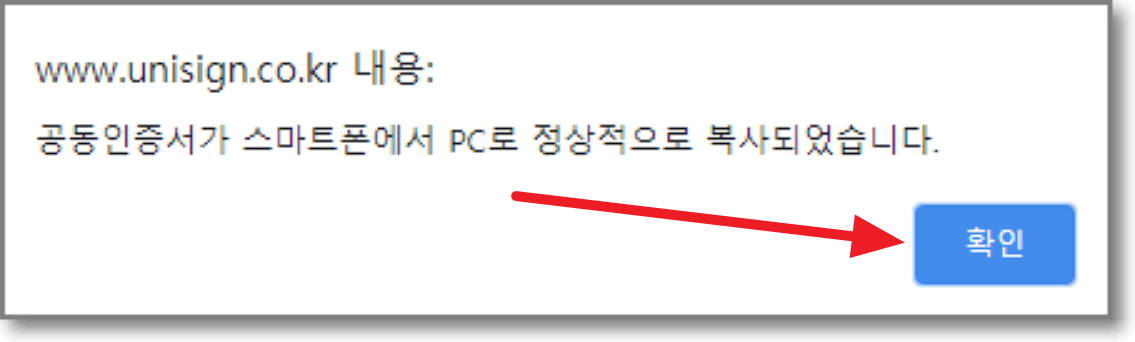 한번 더 알려줍니다. "공동인증서가 스마트폰에서 pc로 정상적으로 복사되었습니다."라고요.