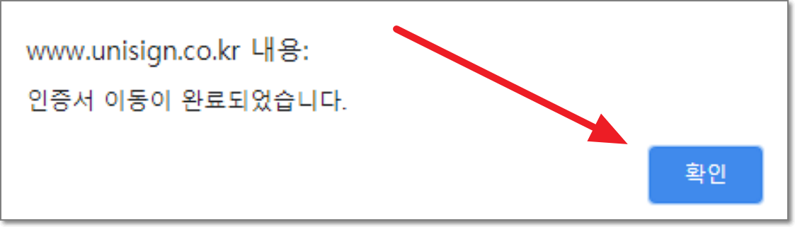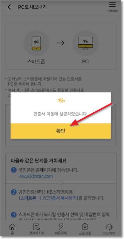 스마트폰에서는 "인증서 이동에 성공하였습니다"라고 나옵니다. "확인"누르시고 다시 pc를 보세요.