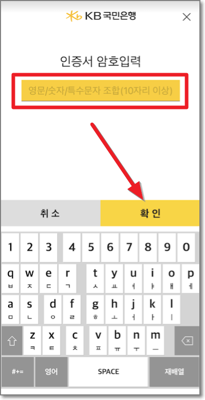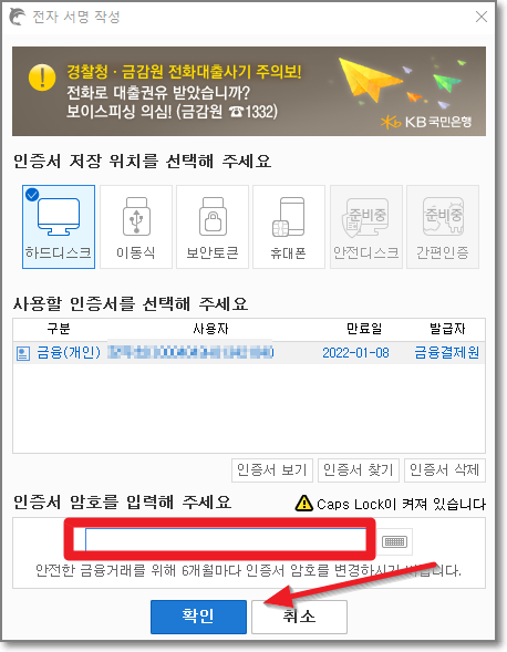 이제 공인인증서의 암호를 묻는데요. 암호를 입력하고 "확인"을 누릅니다.