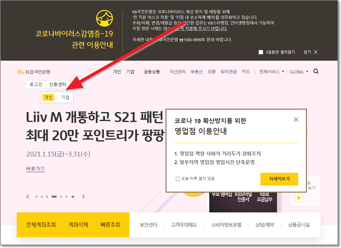 이제 PC를 켜고 국민은행을 접속해야 합니다. 원래는 검색엔진에서 국민은행을 접속하거나 주소창에 kbstar.com을 써야 하지만 여기서는 제가 미리 국민은행바로가기라고 쓴 곳을 누르시면 바로 국민은행 창이 열립니다. 창이 열리면 아래처럼 "인증센터"에 마우스를 가져가고 밑으로 나오는 것중에서 "개인"을 누릅니다.