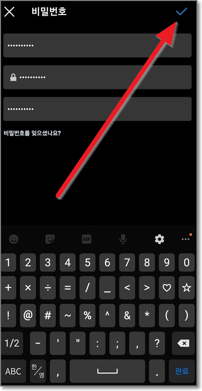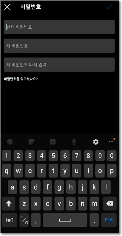모두 입력하고 나면 새 비밀번호를 누르기 전까지만 해도 회색이던 체크표시가 파란색으로 변했습니다. 파란색으로 오른쪽 위에 있는 파란 체크표시를 누릅니다.