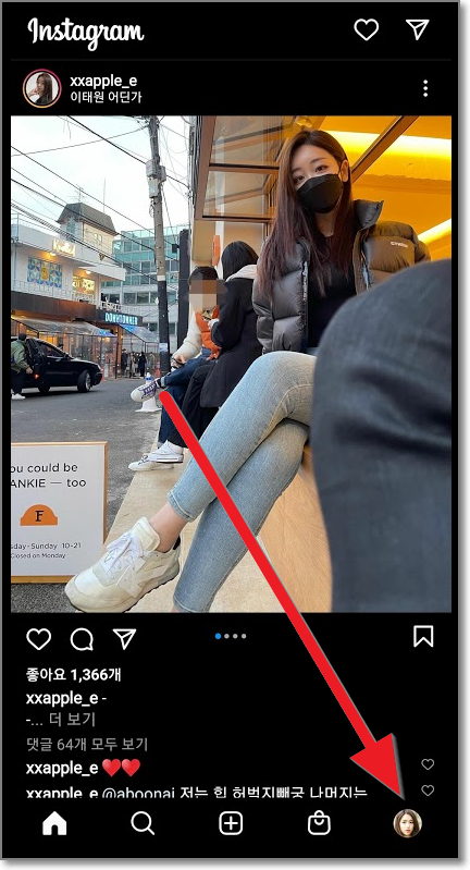 우선 인스타그램을 실행하면 아래처럼 나올텐데요. 여기서 첫화면에서 오른쪽 밑에 있는 자기 프로필 사진을 누릅니다.