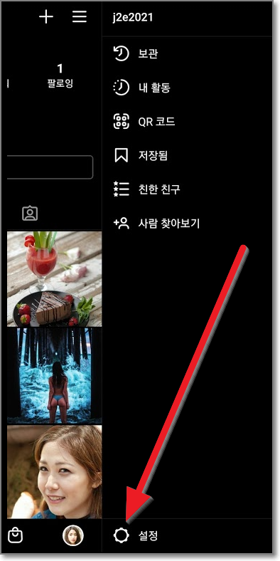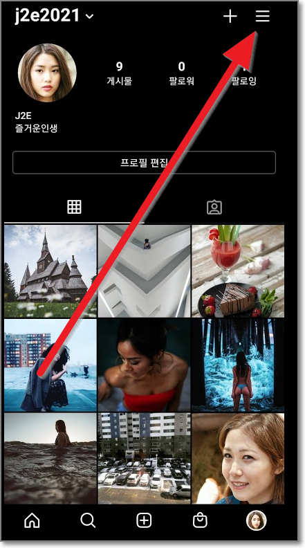 프로필 사진을 누르면 아래처럼 자신의 프로필이 나옵니다. 여기서 위쪽 오른쪽에 있는 줄3개를 누릅니다.