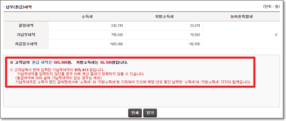 차감징수세액이 마이너스가 나오면 환급이 되는건데요. 이거마저 헷갈릴까봐 아래쪽에 빨간글씨로 자세히 안내가 나옵니다. "고객님의 환급 세액은 565,080원, 지방소득세는 56,500원입니다. 즉 621,580원을 받게되는 것입니다.