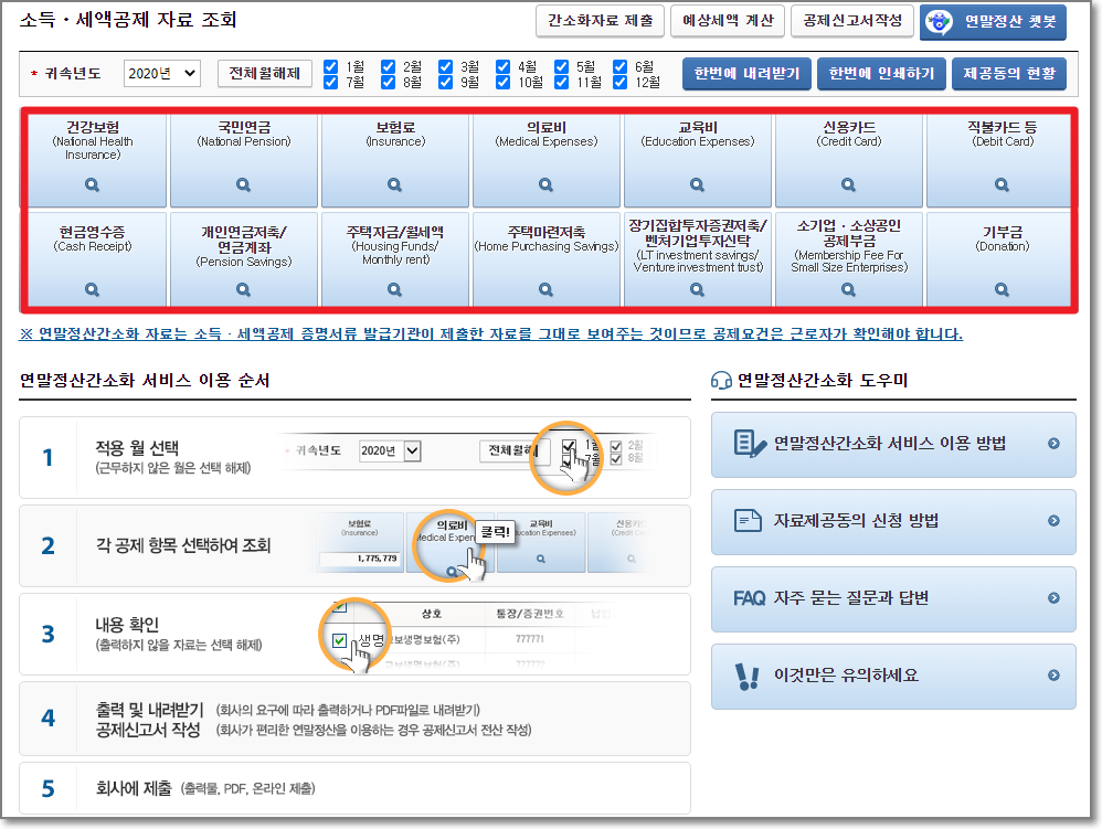 직접 총무부나 경리부에 제출하는 경우에는 미리 준비한 소득공제 증빙서류 실물과 프린트한 공제신고서를 함께 담당자에게 제출하시면 됩니다.