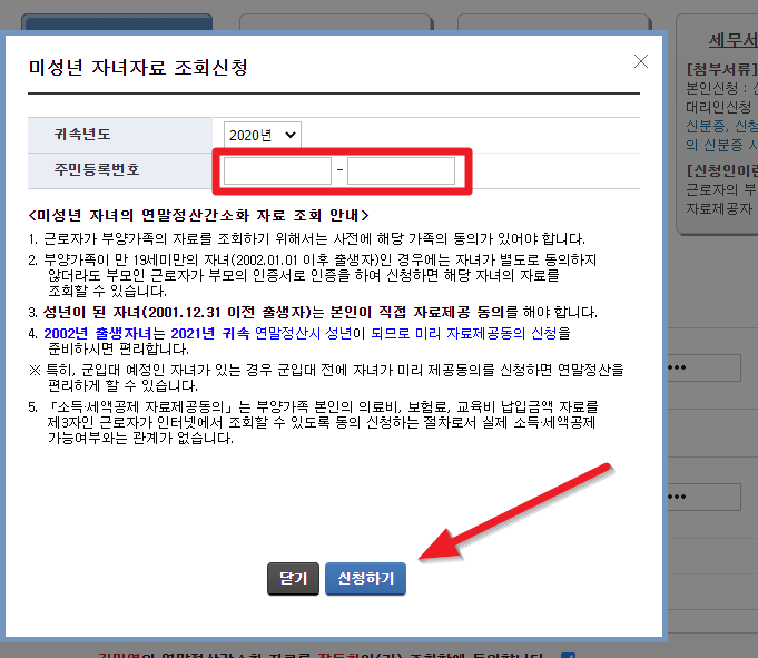 두번째로 미성년자녀자료 조회는 19세미만인 경우 부모가 할 수 있으니 주민번호 입력하고 하단에 있는 "신청하기"누르면 됩니다.