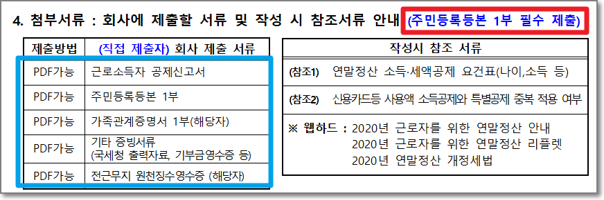 이상으로 연말정산 직접 하는 간편한 방법에 대해서 알아보았는데요. 회사에서는 아래처럼 주민등록등본1부를 필수로 제출하라고 하는 경우도 있습니다. 아래 파란박스처럼 직접 제출자 역시 공제신고서와 주민등록등본1부입니다.