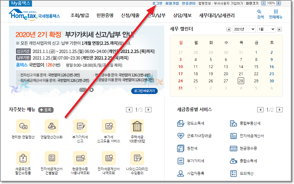 연말정산을 하기 위해서는 국세청 홈택스에 접속해야 합니다. 국세청 홈택스 바로가기를 눌러서 새창으로 띄우시고 이글과 함께 보시기 바랍니다. 아래와 같은 화면에서 "로그인"을 누릅니다.