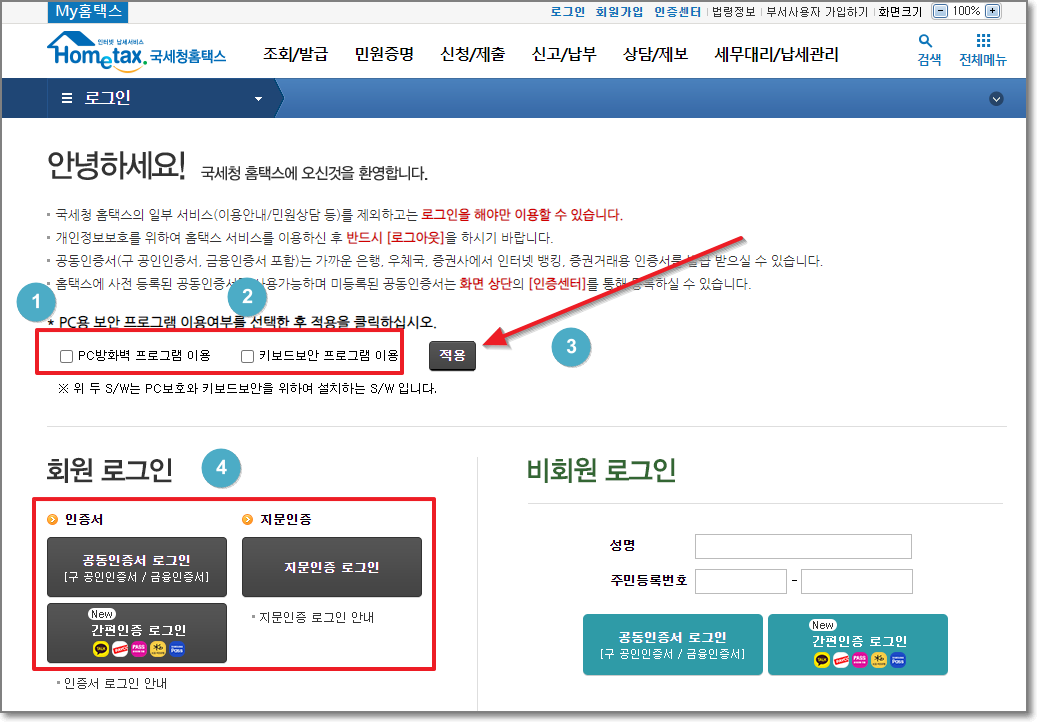동그라미안에 숫자가 있는 1번과 2번, 3번, 4번 차례대로 클릭하고 공동인증서, 간편인증 등 원하시는 것으로 로그인을 합니다. 공동인증서(구 공인인증서)가 없다면 카카오톡 간편인증이 편리하니 참고해주세요.