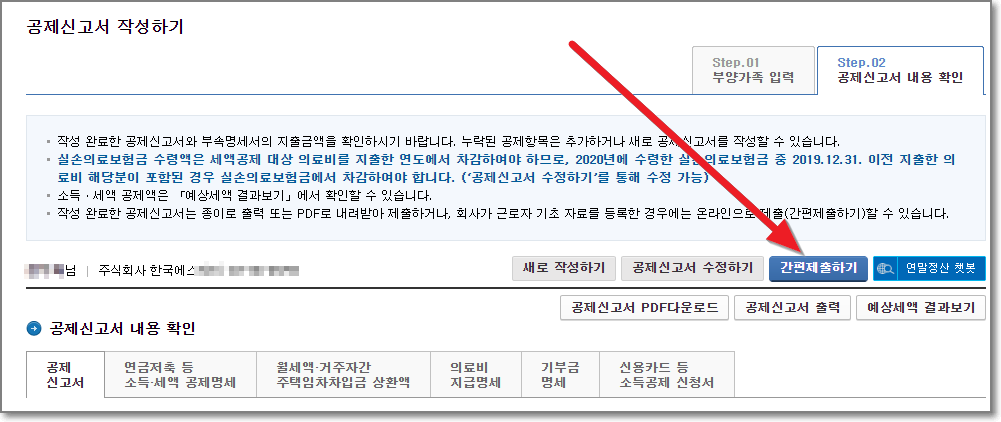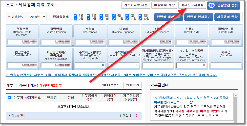클릭하면 모두 자동으로 전산이 가져오게 됩니다. 끝나면 우측위에 있는 "공제신고서작성"을 누릅니다.