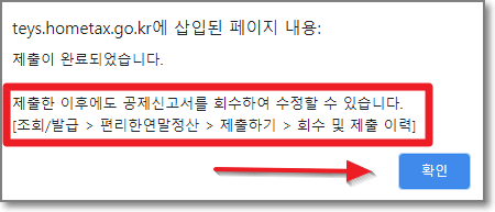 팝업창이 뜨면서 공제신고서를 작성한다고 합니다. 혹시 한번 작성한 적이 있다면 이번 것으로 즉 최신것으로 갱신이 되는 시스템입니다. "확인"을 누릅니다.