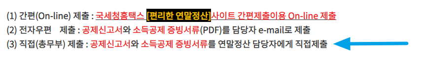 (3) 직접(총무부) 제출 : 공제신고서와 소득공제 증빙서류를 연말정산 담당자에게 직접제출
