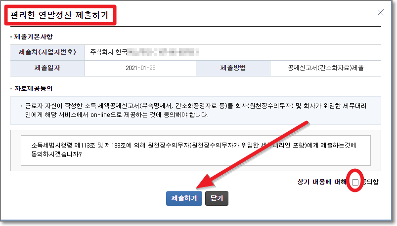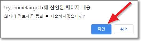 그러면 아래처럼 "회사에 정보제공 동의 후 제출하시겠습니까?"를 물어보는데요. "확인"을 누릅니다.