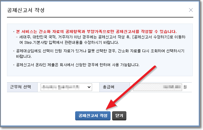 공제신고서 작성에 앞서 근무처와 총급여를 확인하고 "공제신고서 작성"을 누릅니다.