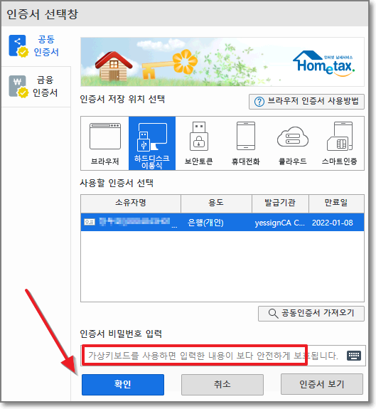 여기서는 공동인증서로 로그인을 하도록 하겠습니다. 공동인증서 창이 뜨면 암호를 입력하고 확인을 눌러서 로그인을 합니다.