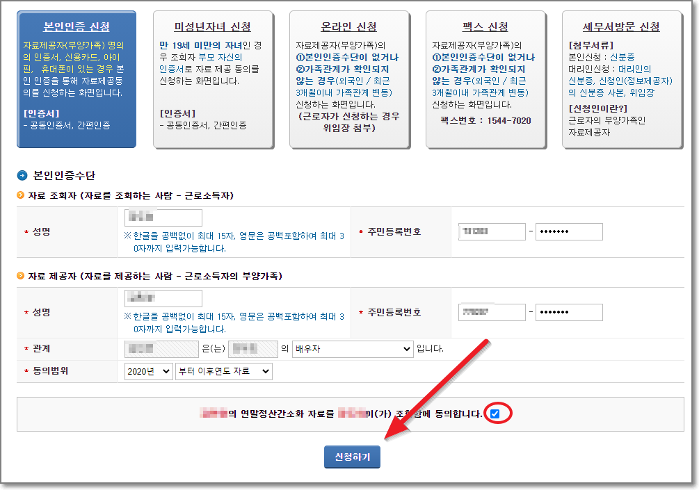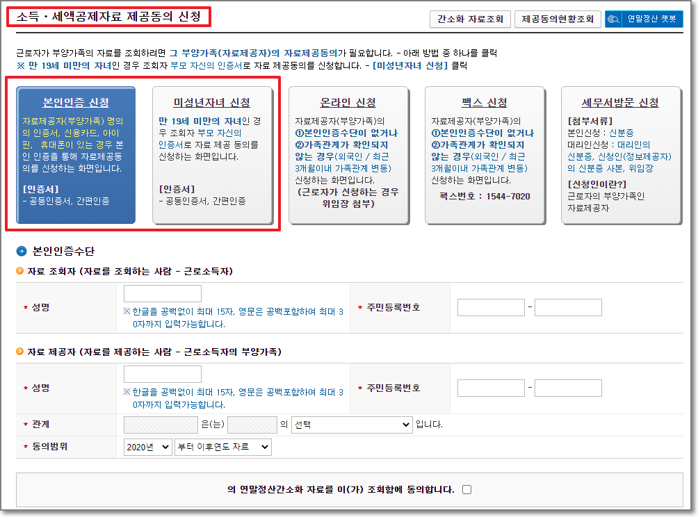 소득.세액공제자료 제공동의 신청 화면에서 본인인증 신청을 하고 19세 미만 미성년자녀 신청을 차례대로 합니다. 우선 본인인증 신청부터 하겠습니다.