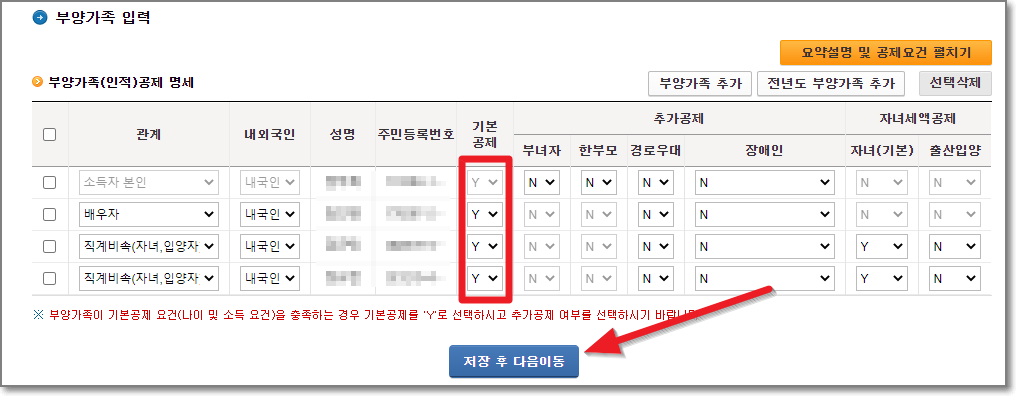 부양가족 입력이 먼저 나오는데요. 같이 살고 있는 가족기준으로 나옵니다. 기본공제쪽에서 N으로 되어있는 경우가 많은데 Y로 고치고 나머지도 해당사항이 있는지 잘 보신 후에 Y로 고치고 "저장 후 다음이동"을 누릅니다.