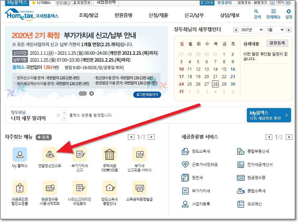 이제 국세청 홈택스에 로그인 되었습니다. 화면에서 "연말정산간소화"를 누릅니다.