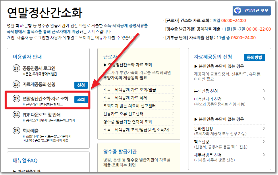 자료제공동의 신청이 끝났으면 다시 첫화면으로 돌아와서 이번에는 3번 "연말정산간소화 자료 조회" 옆에 있는 "조회"버튼을 누릅니다.
